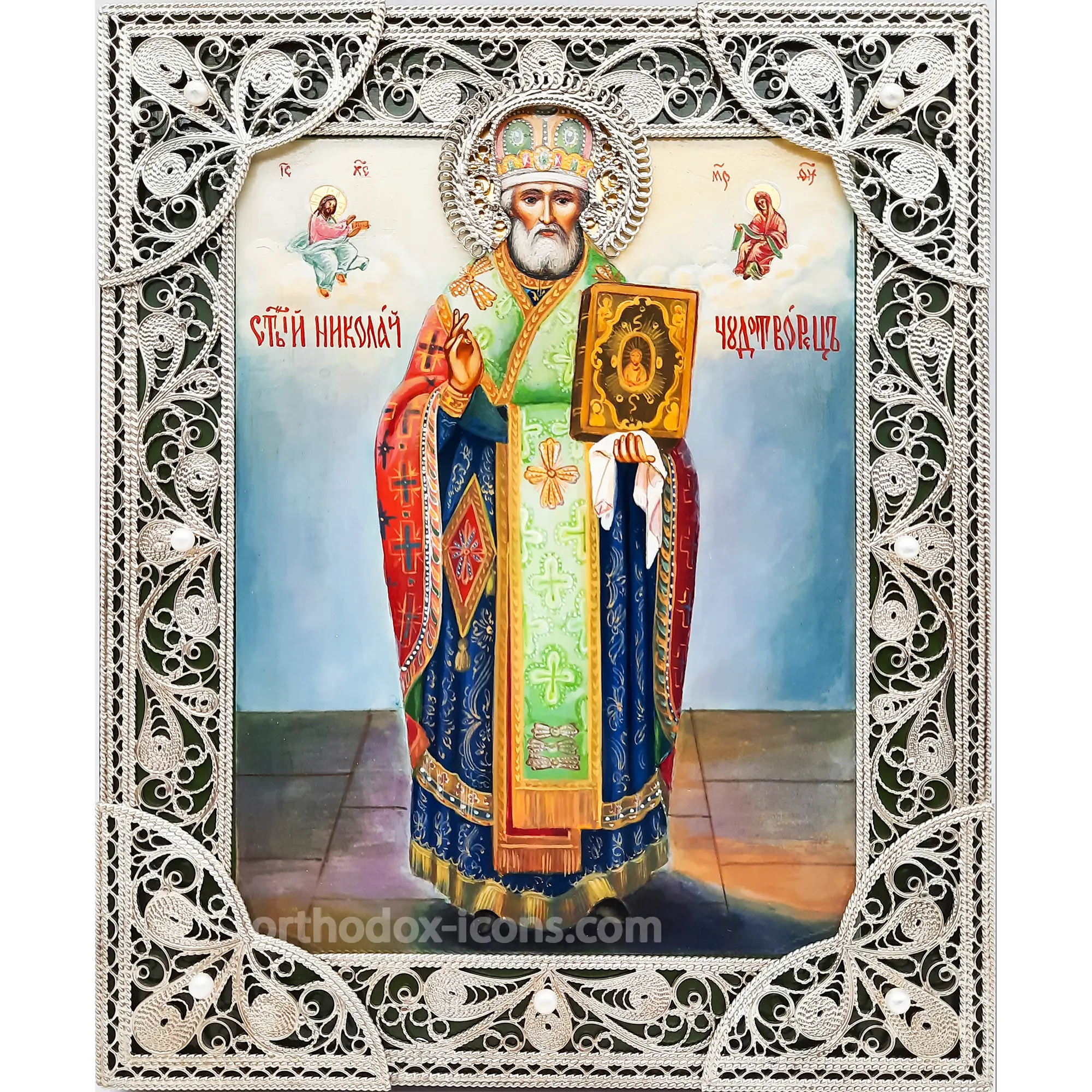 Filigree Icon of Saint Nicholas the Wonderworker will be painted for you in the workshop to order.