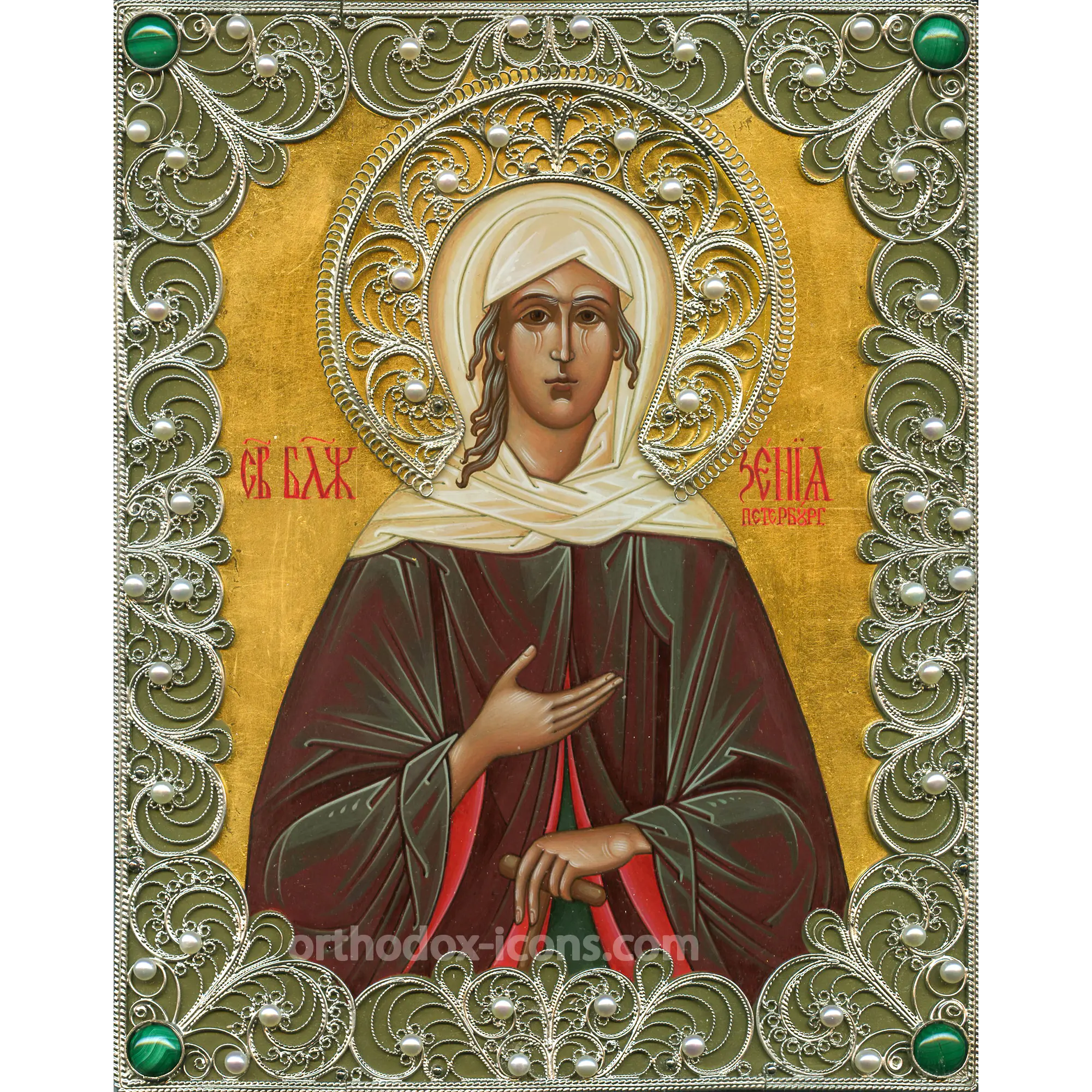 Order the Filigree Orthodox Icon of St. Xenia at the icon painting workshop “Mstyora Icons,” located in Mstera, Vladimir region, where icons have been painted since 1628.