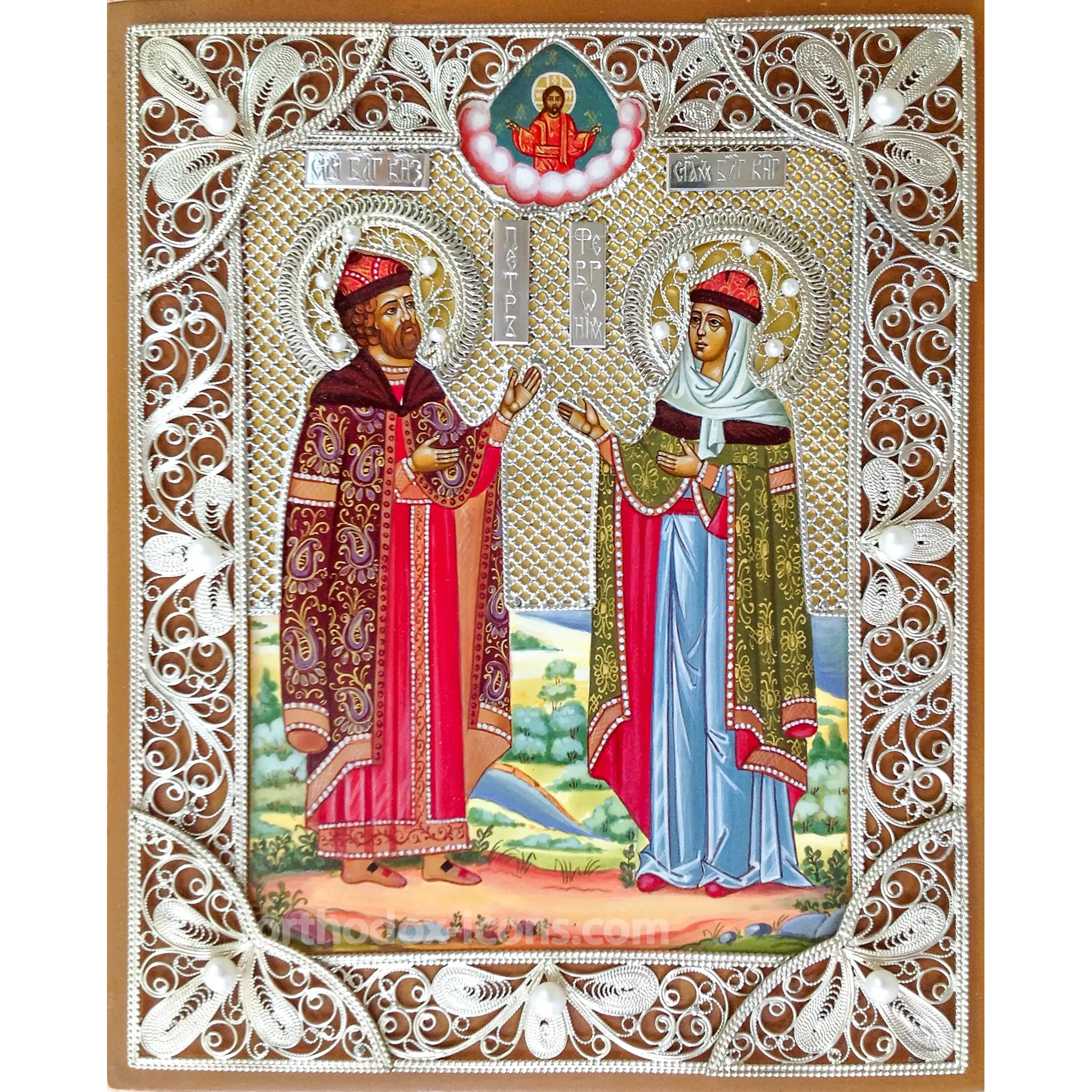 Order the Peter and Fevronia Filigree Icon at the icon painting workshop “Mstyora Icons,” located in Mstyora, Vladimir region, where icons have been painted since 1628.