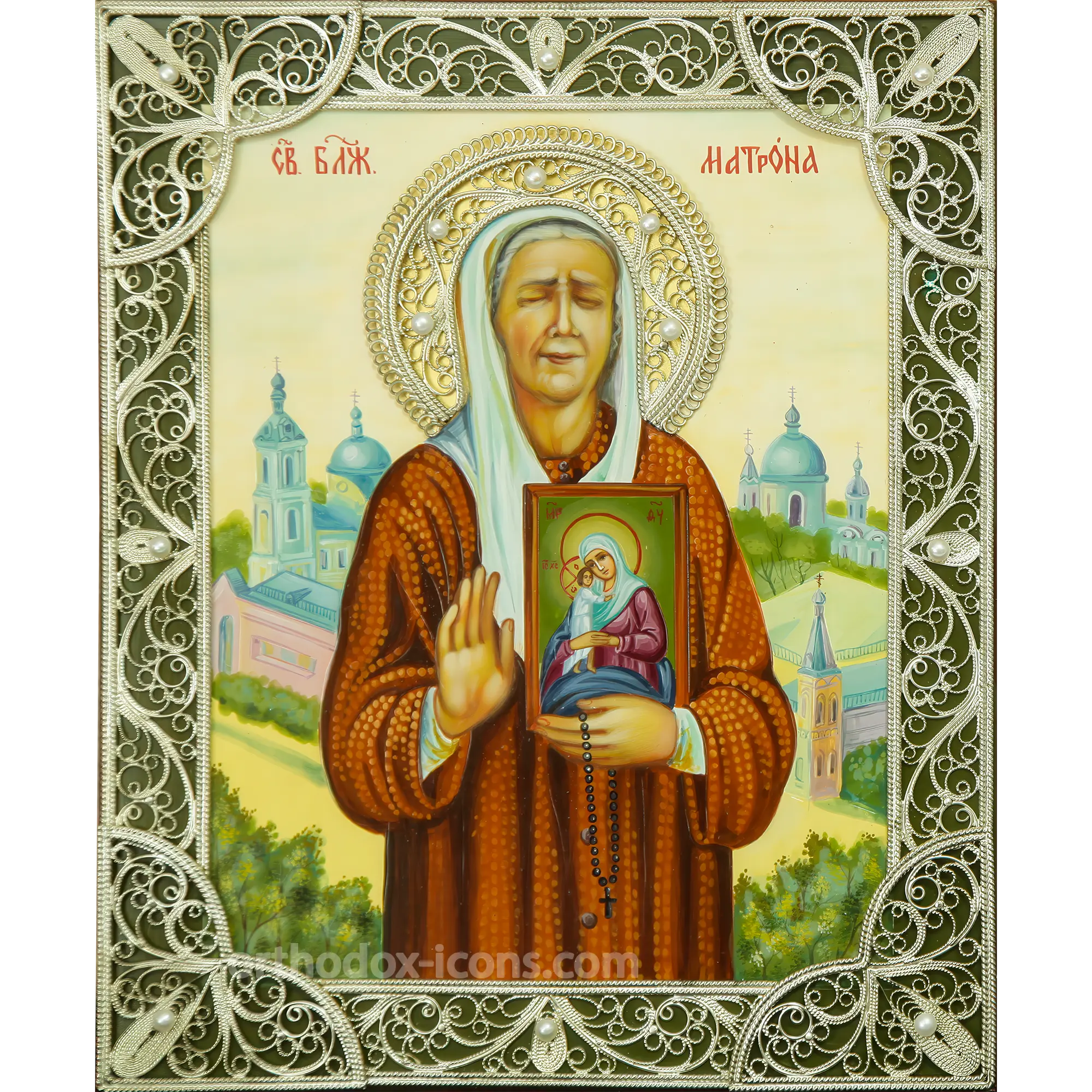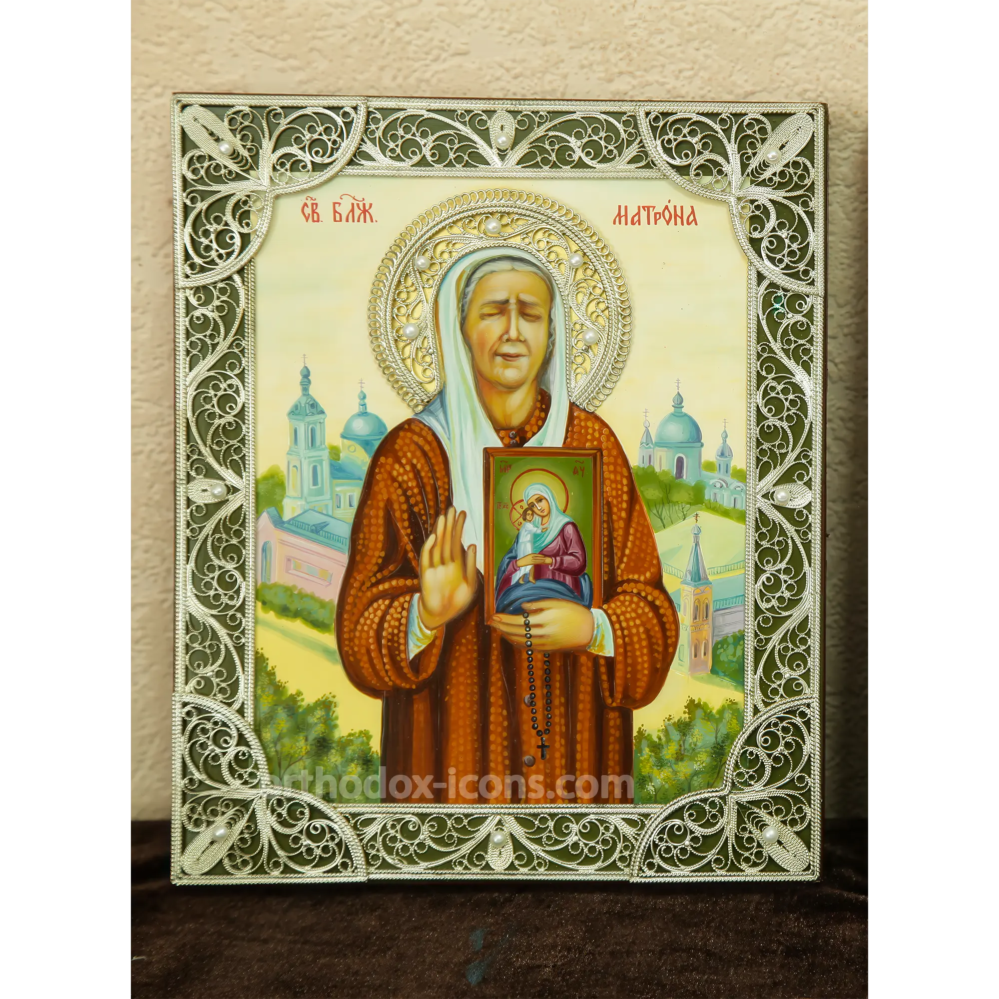 Order The Filigree Icon of Saint Matrona at the icon painting workshop “Mstyora Icons,” located in Mstyora, Vladimir region, where icons have been painted since 1628.