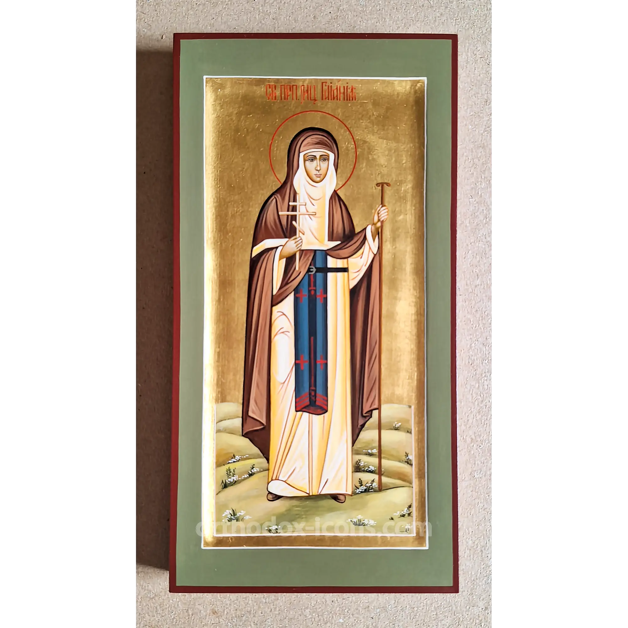 The Gaiana Orthodox Icon depicts Saint Gaiana, a holy woman known for her devotion to God and her ability to bring healing and comfort to those in need. The icon portrays Saint Gaiana with a serene expression, holding a cross and a sprig of healing herbs, symbolizing her role as a healer and her connection to divine grace.