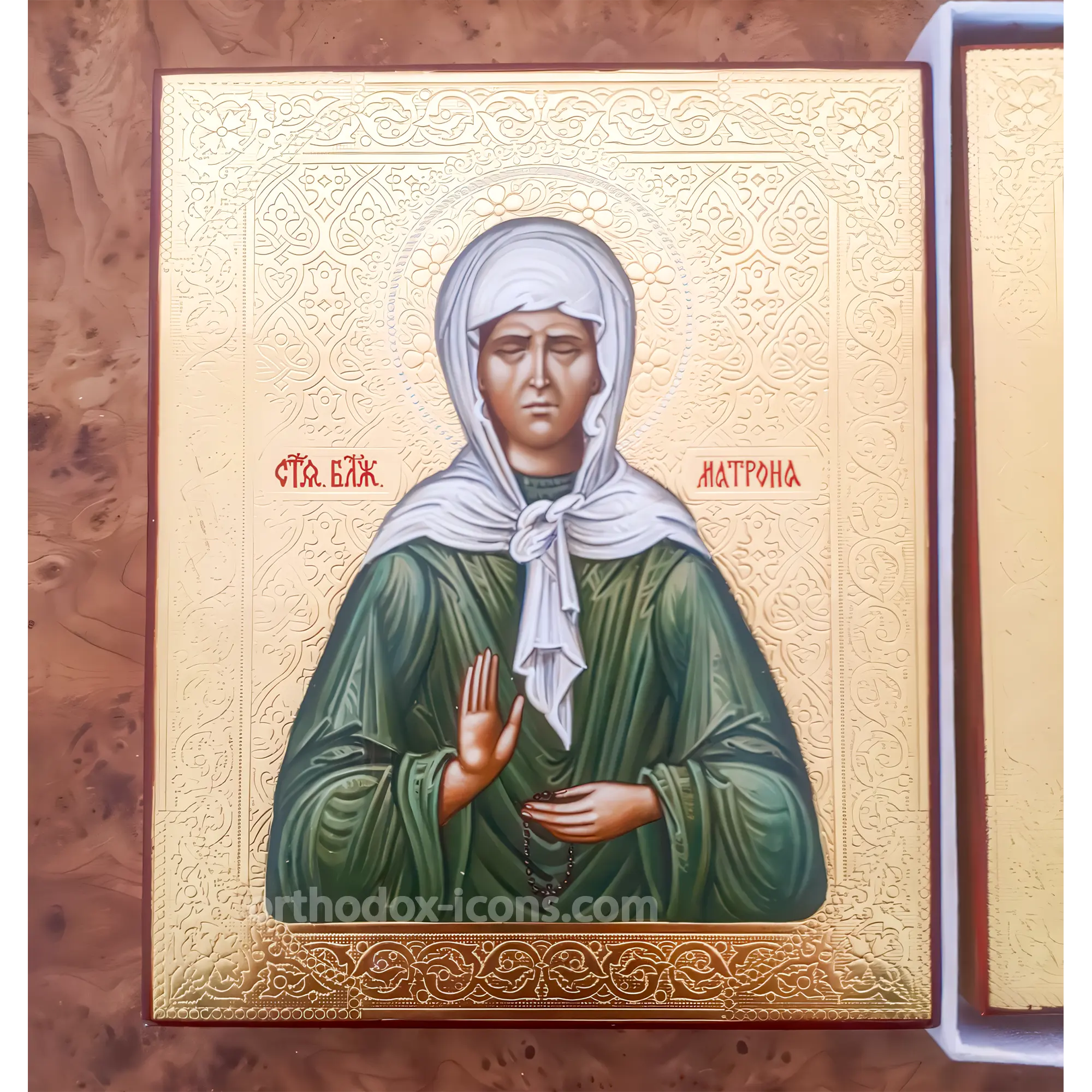 The hand-painted icon of Matrona of Moscow depicts St. Matrona, also known as Matrona Dmitrievna Nikolina, who lived in Moscow in the 1920s and 1930s. This icon has special significance for Orthodox believers, and Matrona of Moscow is considered one of the most revered saints in Russia. Matrona of Moscow is widely known and popular among Russian Orthodox believers. Her icon is often found in homes and temples, and she is considered especially close to people.
