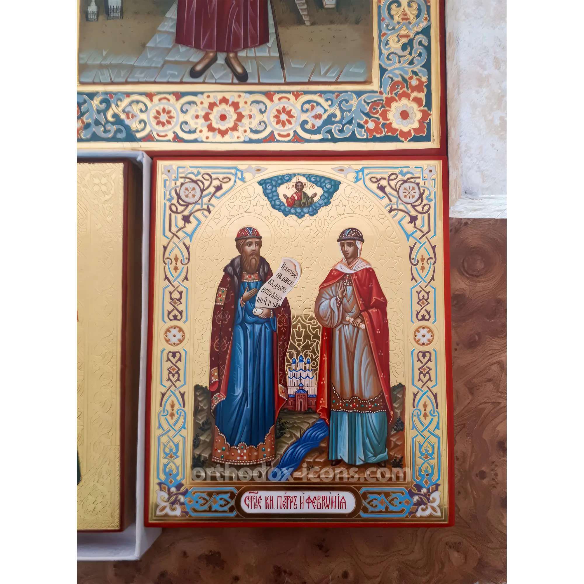 The hand-painted icon of Saints Prince Peter and Fevronia depicts Saints Peter and Fevronia, who are among the most revered saints in Orthodoxy. This icon symbolizes several important aspects: