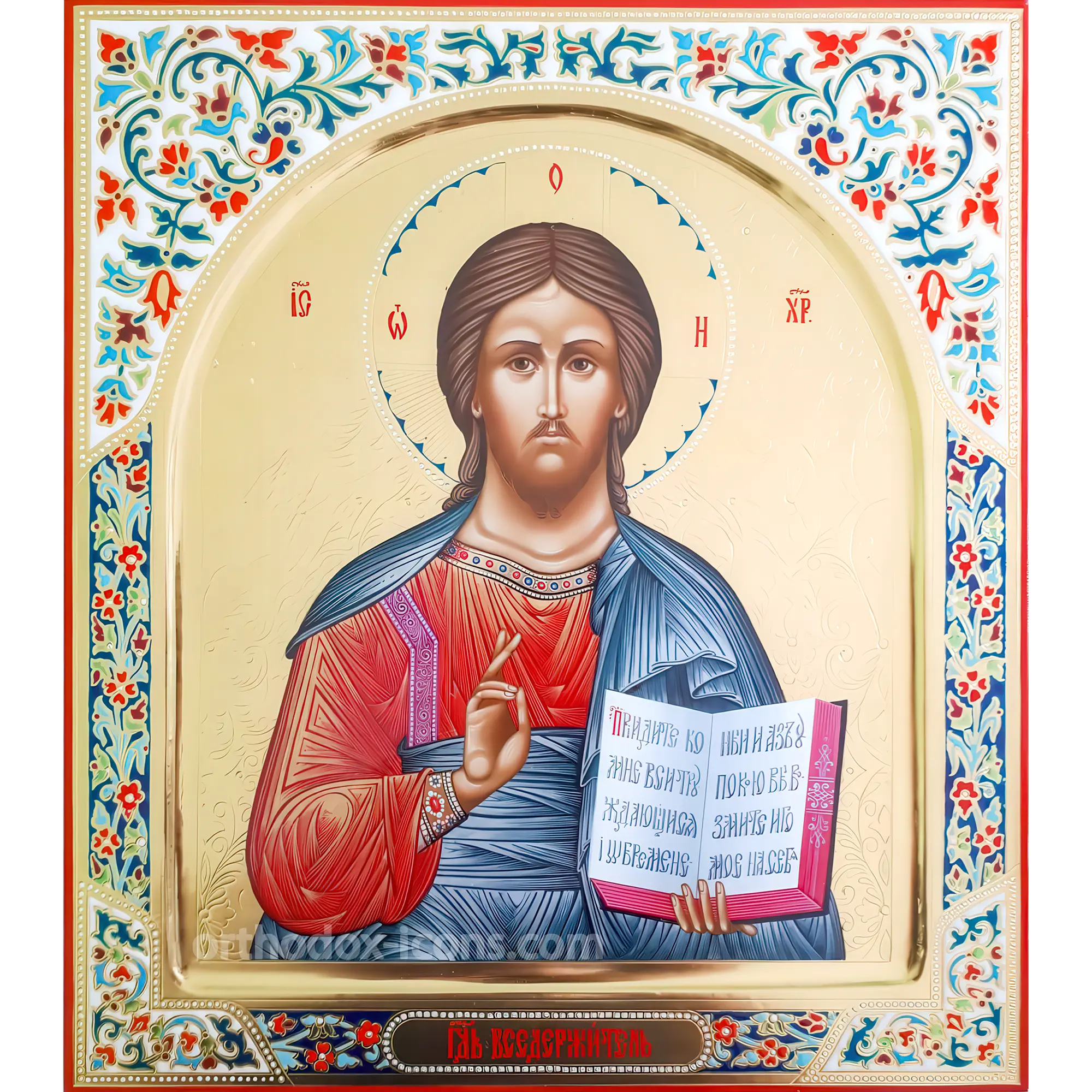 A hand-painted icon of the Lord Almighty depicts Christ as Heavenly King and Judge. In the center of the icon is an image of Christ, usually full-length, with a lofty pose and majestic expression. He usually holds an open Gospel in one hand, symbolizing spiritual teaching, and raises his right hand in a gesture of blessing. Christ is usually depicted wearing a long robe that covers his shoulders and legs and is clothed in a mantle that is sometimes decorated with gold or precious designs. His head is usually surrounded by a halo, indicating his holiness and divinity.