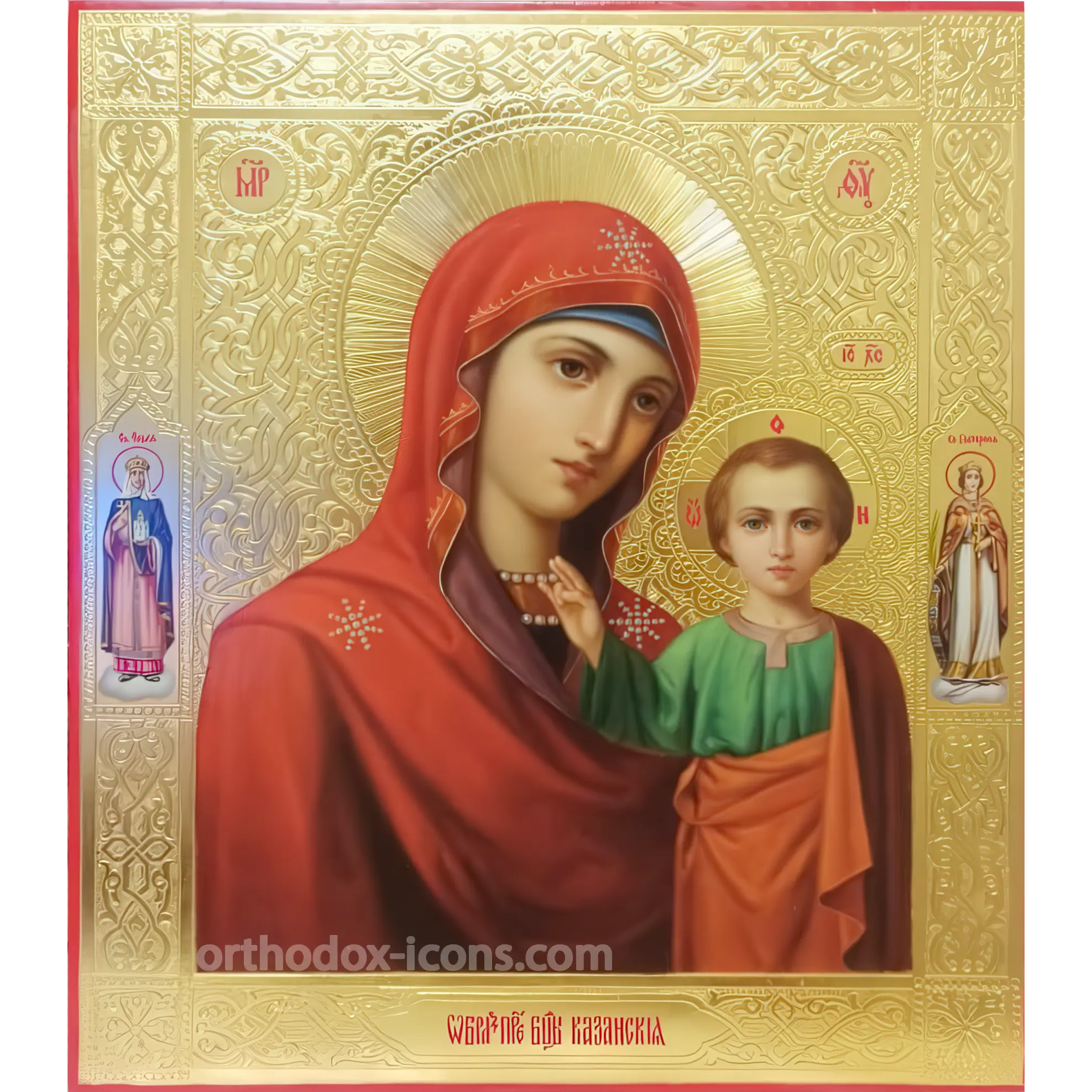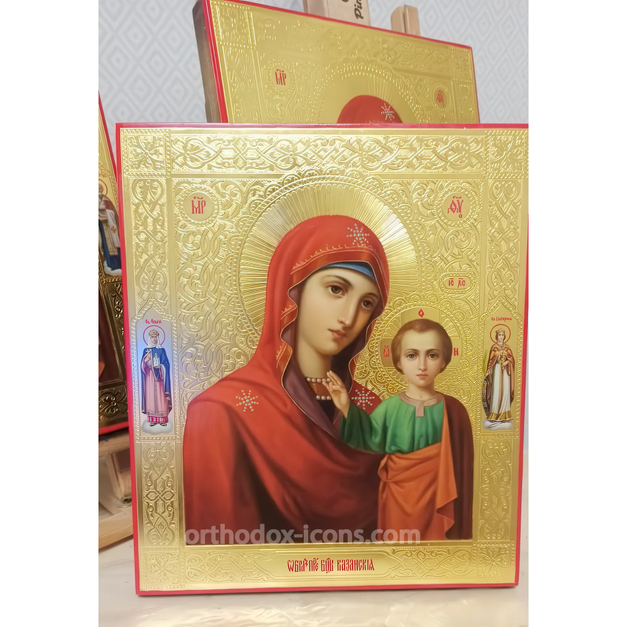The hand-painted icon of the Mother of God of Kazan depicts the Virgin Mary with the Child Jesus. This icon is one of the most revered and recognizable icons in Orthodoxy. On the icon of the Virgin Mary, the Mother of God is depicted standing, holding the Child Jesus on her left arm. She is usually depicted in a golden garment and covered with a veil. Jesus Christ can be depicted with an open palm, blessing, or with a closed palm, symbolizing a predestined fate.