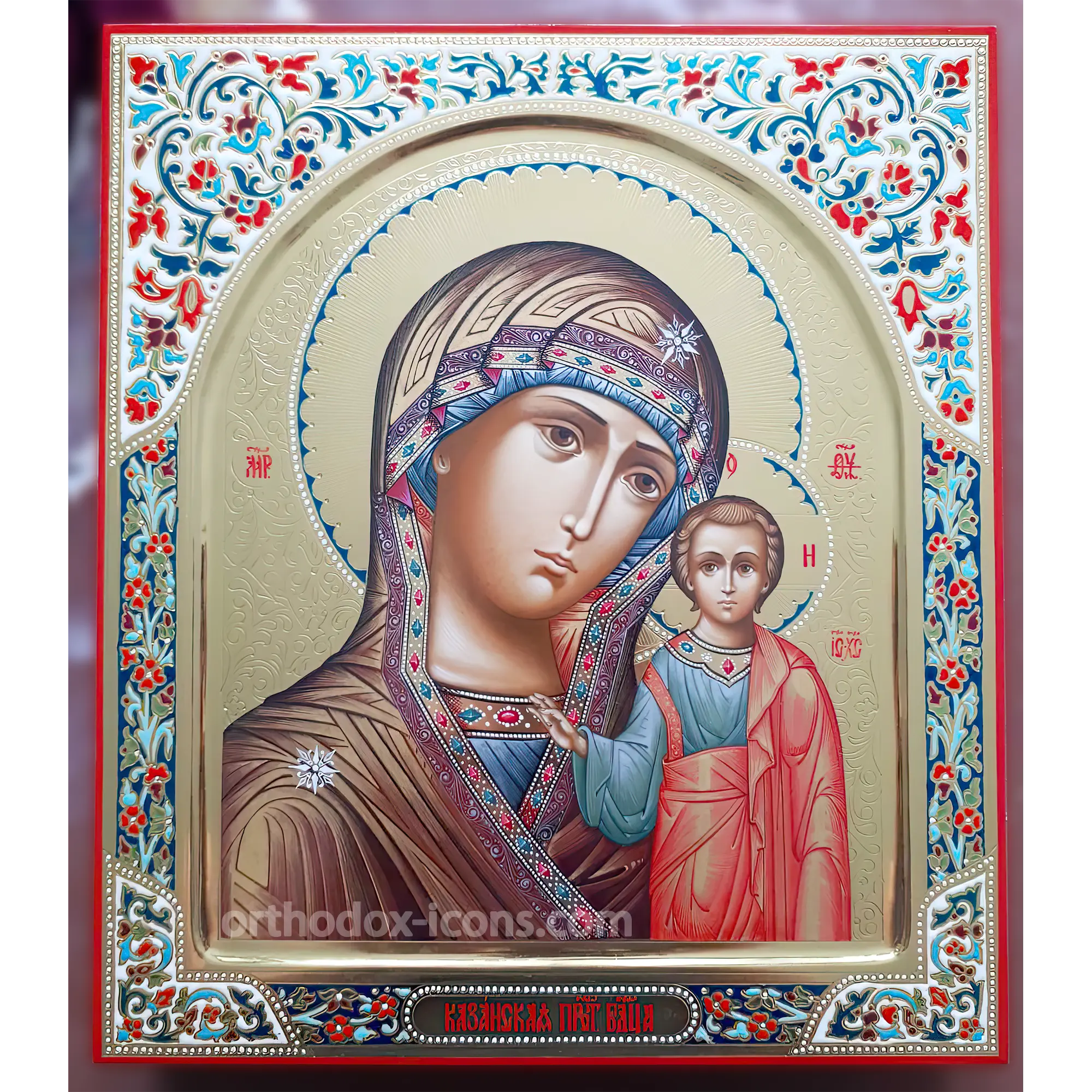 The hand-painted icon of the Mother of God of Kazan depicts the Mother of God with the Child Jesus in her arms. It is one of the most revered and famous icons of the Blessed Virgin Mary in Orthodoxy. The icon of the Mother of God of Kazan is usually depicted with grace and mercy. The Mother of God holds the Child Jesus on her left arm and covers Him with her right hand. She may be depicted with or without a crown. The Child Jesus can hold his hand in a blessed gesture or point to the Virgin.
