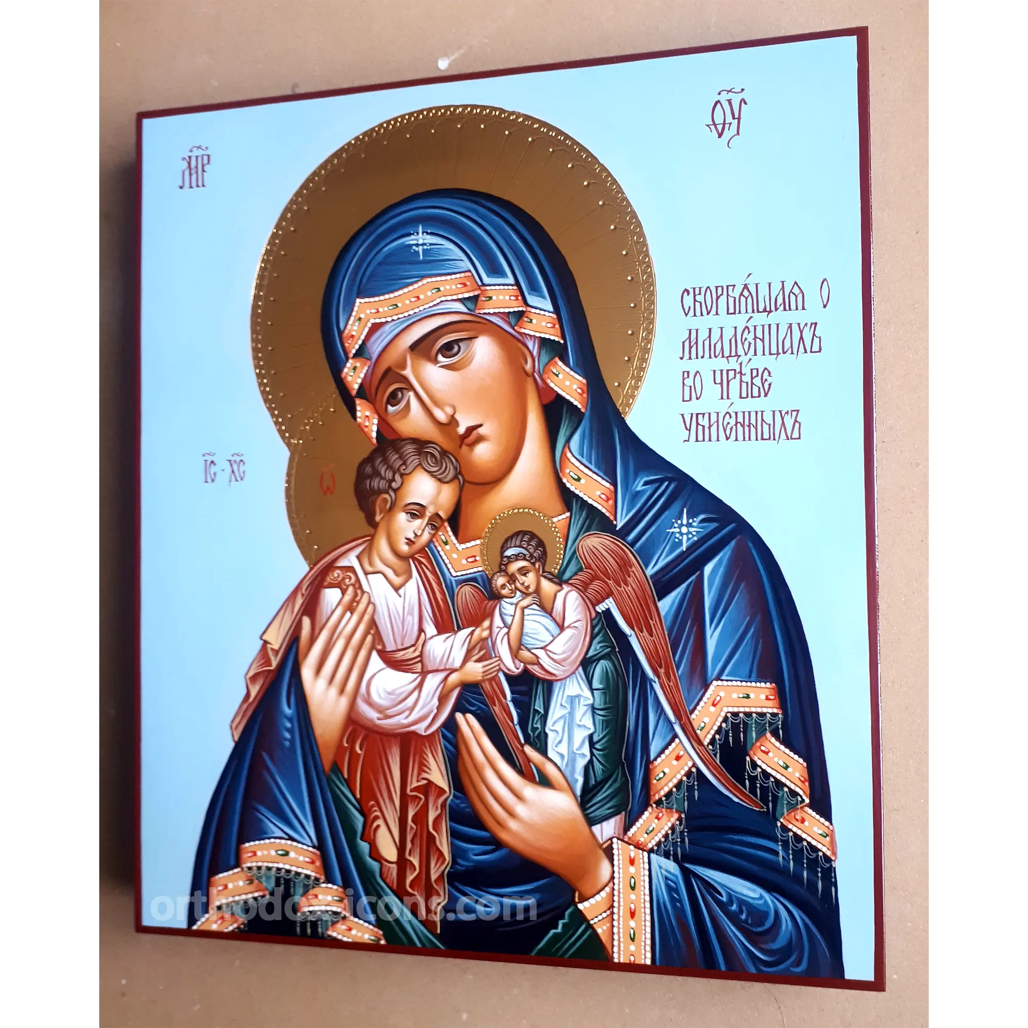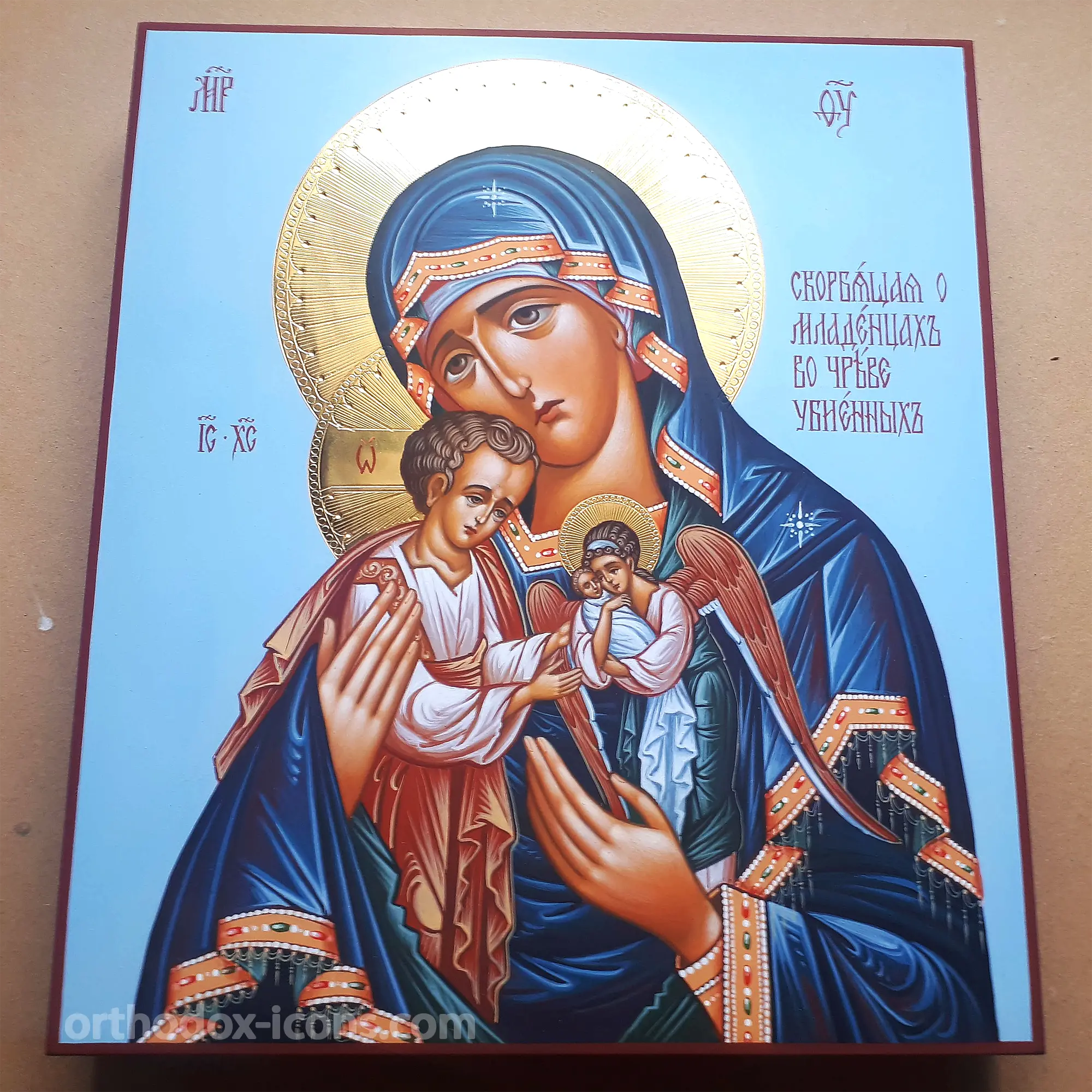 In the icon-painting workshop “Mstyora Icons” you can buy the icon of the Mother of God Mourning for the Murdered Babies, which is made in the best traditions of Russian icon-painting. The hand-painted icon of the Mother of God is not only an expression of spiritual upliftment and faith, but also a true work of art, which will become an exquisite decoration of your iconostasis.