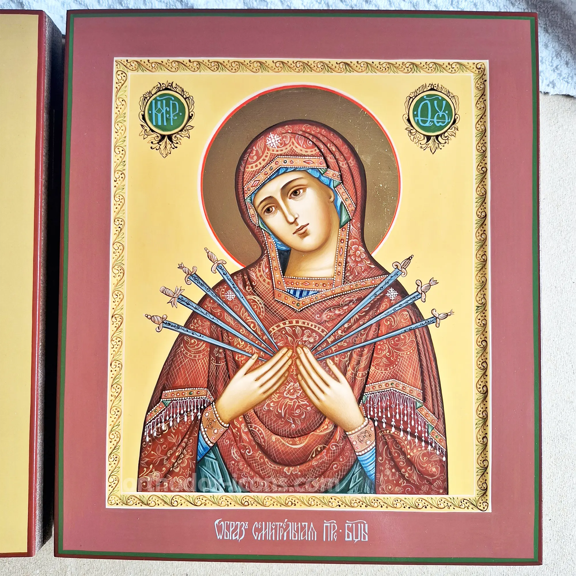 Commission The Seven Arrows Icon of Virgin Mary from the skilled artisans at the ‘Mstyora Icons’ workshop, nestled in the village of Mstyora, Vladimir region, with a legacy of icon painting since 1628.
