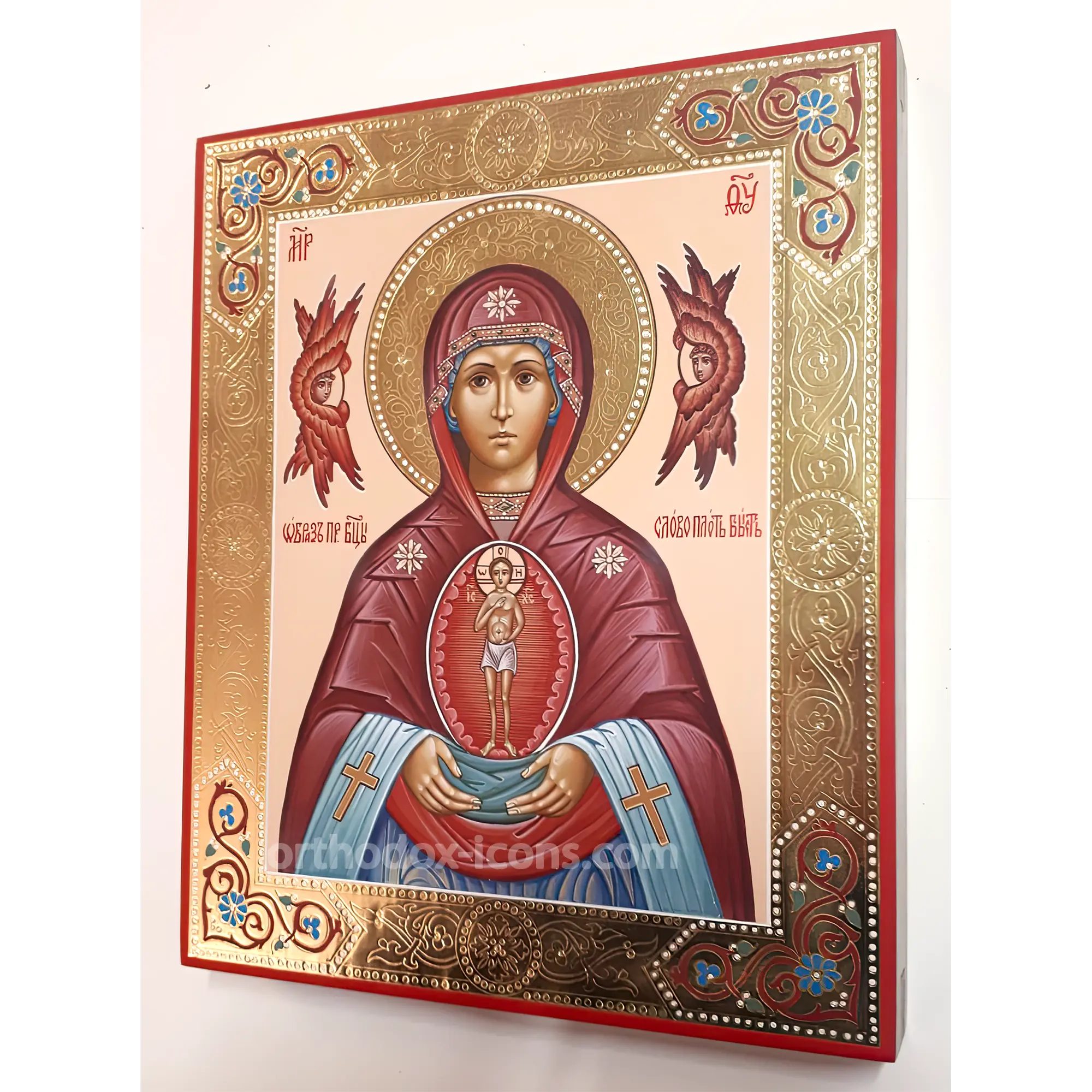 The hand-painted icon “The Image of the Most Holy Mother of God, the Word Made Flesh” is one of the most significant images in Orthodox iconography dedicated to the Incarnation of the Word of God. This image reflects the moment of the greatest spiritual event – the incarnation of the Son of God, Jesus Christ, in the womb of the Blessed Virgin Mary.